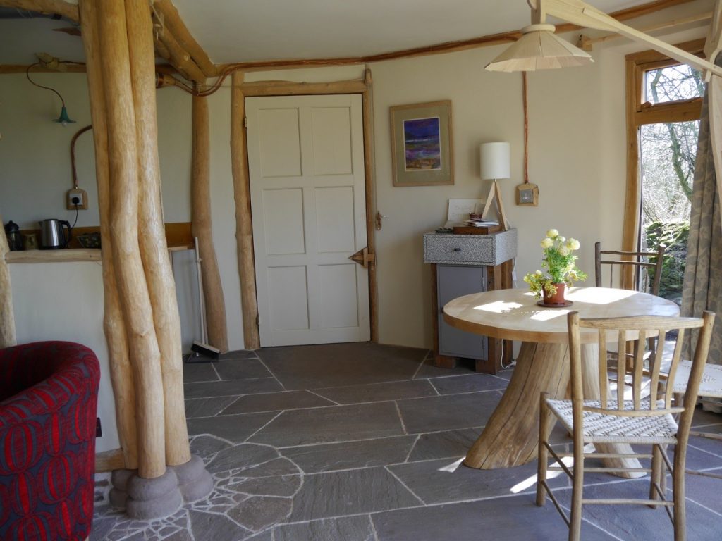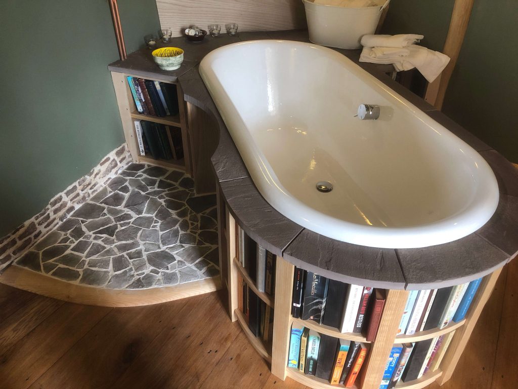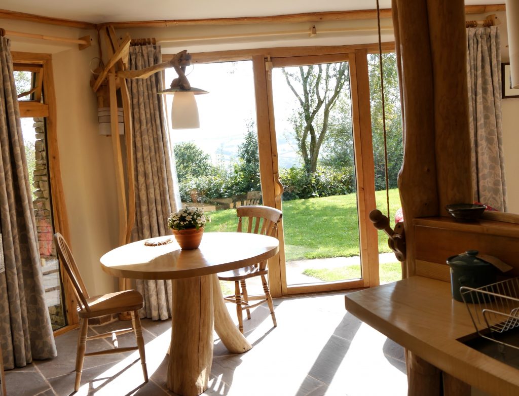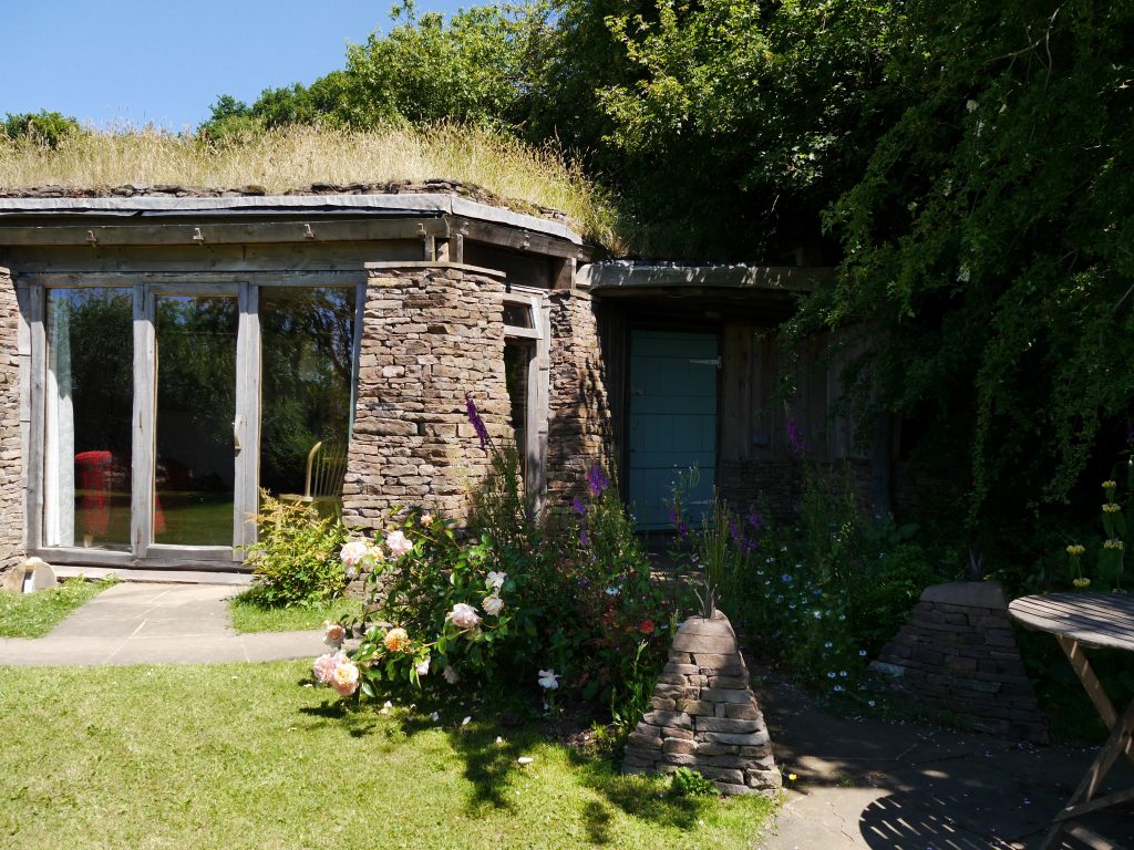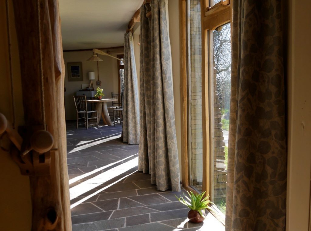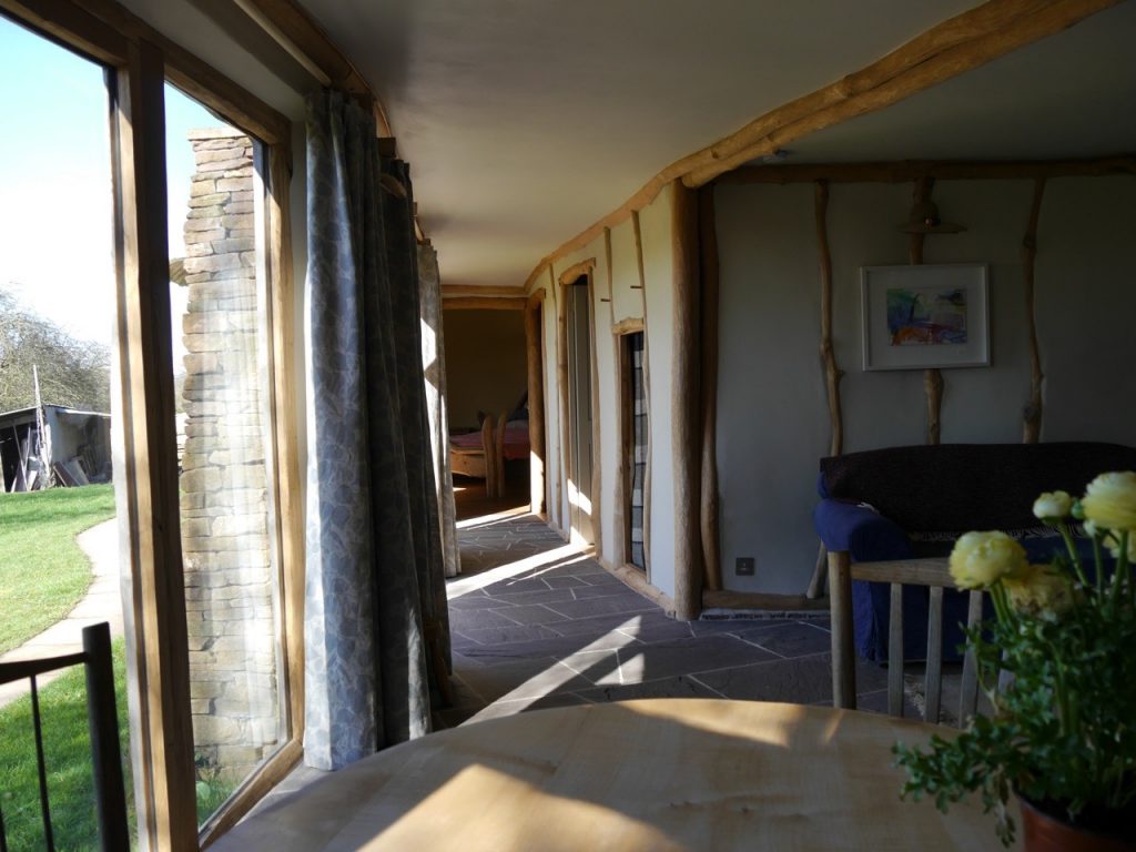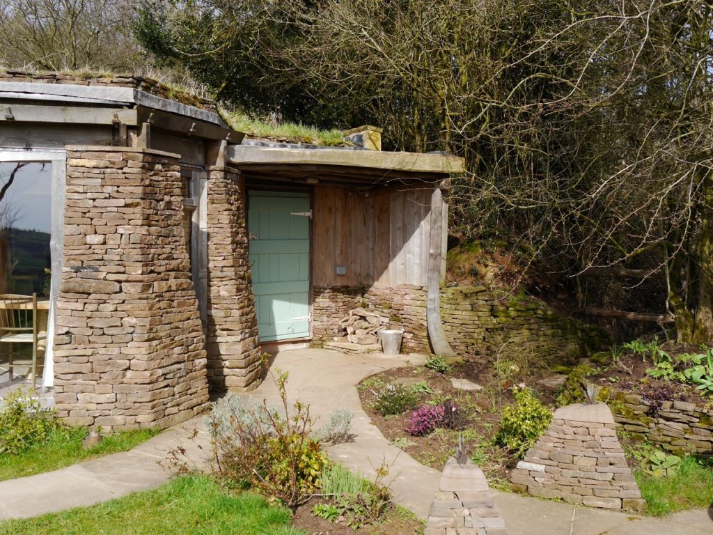 The DugOut is a turf-roofed, handcrafted earthhouse in a secluded spot next to our woodland. Like the Big House, the DugOut has sensational views. It is very special to us as it was our home for ten years whilst Ed was building and crafting the Big House and it is a pleasure to share this unique retreat with our guests. The DugOut is nestled snugly into the hill looking south over its own private garden and lawn to a fabulous far-reaching view taking in three counties. Whether you are soaking in the bath whilst taking in the view, curled up by the fire reading a book or eating alfresco on the terrace, we are confident you will enjoy the privacy and tranquility of the Dugout.